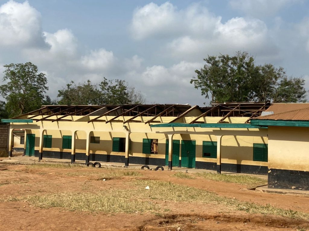 Strong winds accompanied the rains, which lasted about an hour, ripping off the roofs of about 15 classrooms, including the primary school block’s office and computer lab, and collapsing the JHS block, leaving the furniture and teaching and learning materials vulnerable to rain.