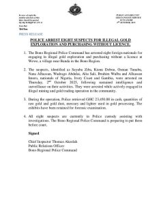 The Bono Regional Police Command has arrested eight foreign nationals for engaging in illegal gold exploration and trading without a licence at Wewe, a village near Banda in the Bono Region.