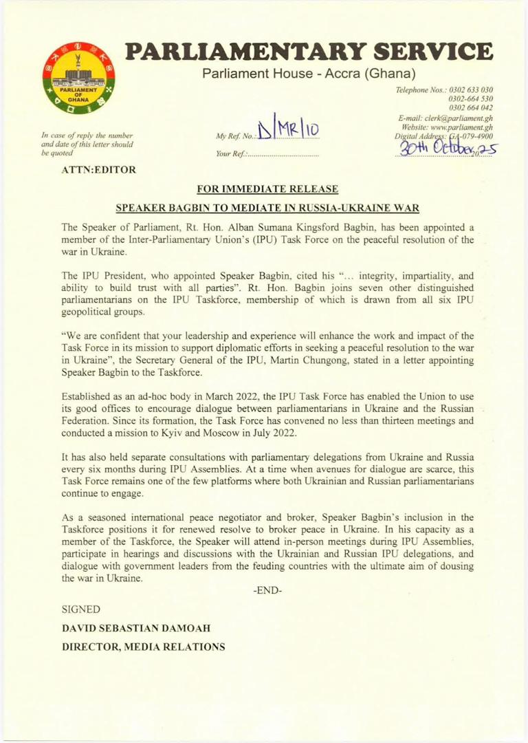 The Speaker of Ghana’s Parliament, Rt. Hon. Alban Sumana Kingsford Bagbin, has been appointed as a member of the Inter-Parliamentary Union’s (IPU) Task Force on the peaceful resolution of the war between Russia and Ukraine.