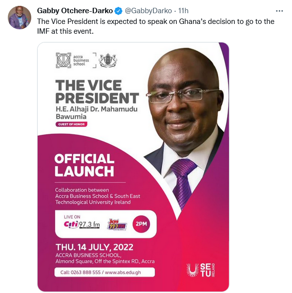 The Vice President Dr Mahamudu Bawumia is expected to speak on Ghana’s decision to go to the International Monetary Fund (IMF) during the official launch of the collaboration between Accra Business School and South East Technological University, Ireland, a leading member of the New Patriotic Party (NPP) Gabby Otchere-Darko has said.