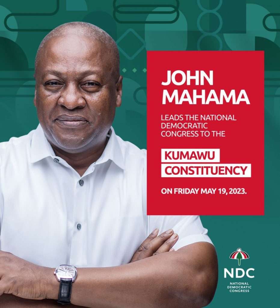 The Presidential Candidate of the National Democratic Congress (NDC), John Dramani Mahama, is leading a delegation to the Kumawu Constituency to campaign for the party’s parliamentary candidate in the upcoming by-election.