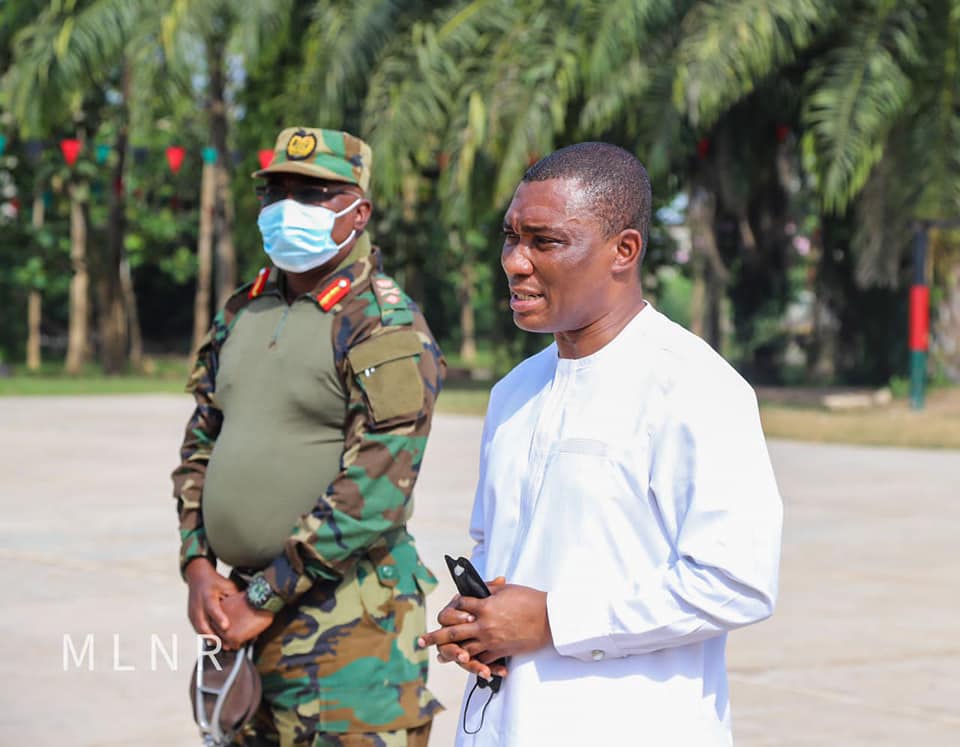 Mr. George Mireku Duker (MP), Deputy Minister for Lands and Natural Resources and Hon. Seth Acheampong, Eastern Regional Minister today, December 22nd 2021 addressed Operation Halt II troops as phase 10 of their operations ended successfully today.