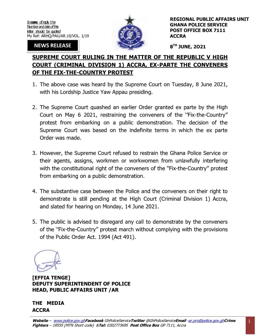 “However, the Supreme Court refused to restrain the Ghana Police Service or their agents, assigns, workmen or workwomen from unlawfully interfering with the constitutional right of the conveners of the ‘Fix-the-Country’ protest from embarking on a public demonstration”. The release said