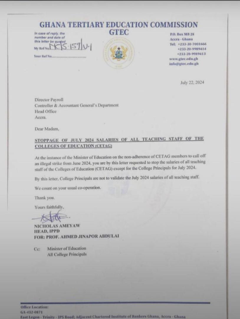 “At the instance of the Minister of Education on the non-adherence of CETAG members to call off an illegal strike from June 2024, you are by this letter requested to stop the salaries of all teaching staff of the Colleges of Education (CETAG) except for the College Principals for July 2024.
