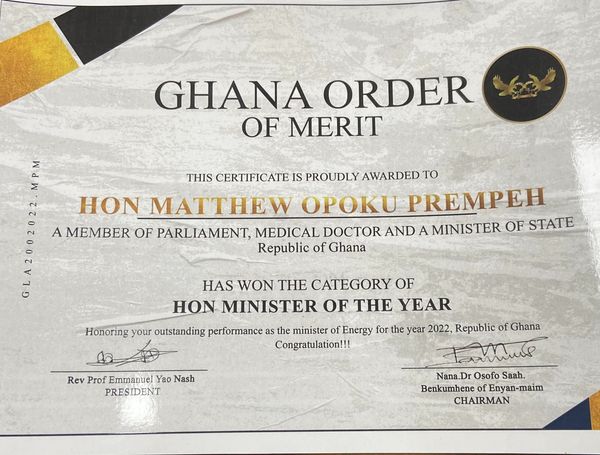 At a colourful event on Saturday, 17th December 2022, Dr Prempeh received the Order of Merit award for his outstanding performance as Energy Minister since assuming office in March 2021.