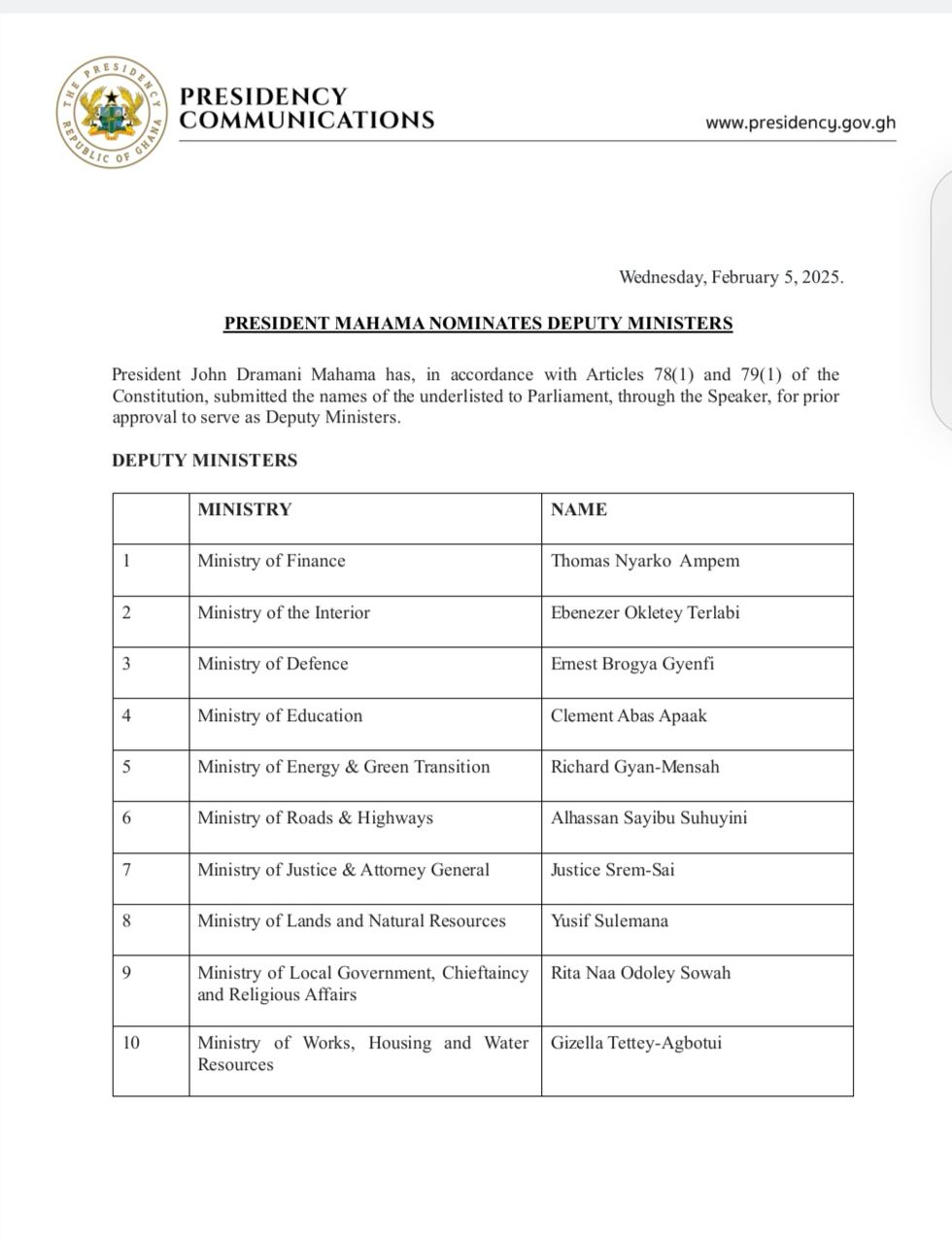 The nominees include Thomas Nyarko Ampem as Deputy Minister-designate for Finance, Ebenezer Okletey Terlabi for Interior, and Ernest Brogya Gyenfi for Defence.