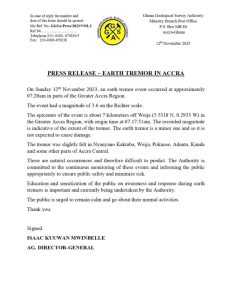 The Ghana Geological Survey Authority (GGSA) says the earth tremor recorded in parts of the Greater Accra Region on Sunday, November 12  is minor thus urge Ghanaians to carry on with their regular activities .