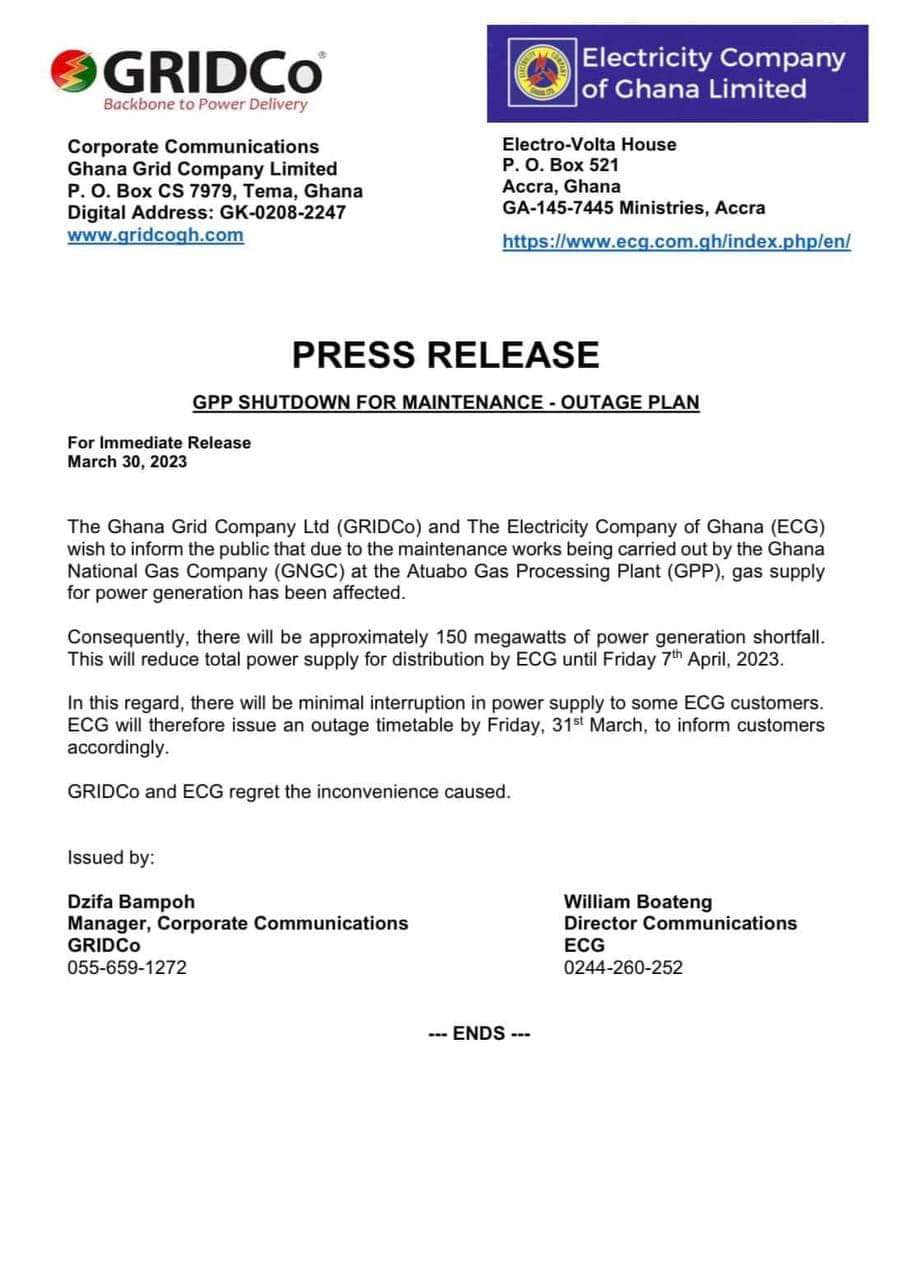 The joint statement also states that there will be approximately 150 megawatts of power generation shortfall which is expected to reduce total power supply distribution by ECG until Friday, April 7, 2023.