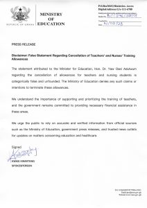 “The statement attributed to the Minister for Education, Hon. Dr. Yaw Osei Adutwum regarding the cancellation of allowances for teachers and nursing students is categorically false and unfounded. The Ministry of Education denies any such claims or intentions to terminate these allowances.