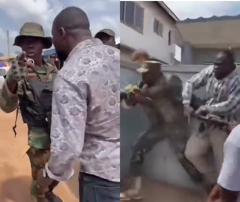 According to a report from TV3, the altercation began when the civilian, identified as the National Democratic Congress (NDC) Communication Officer for the Obuasi East constituency, questioned the soldiers’ presence in the inner perimeter of the voting area.