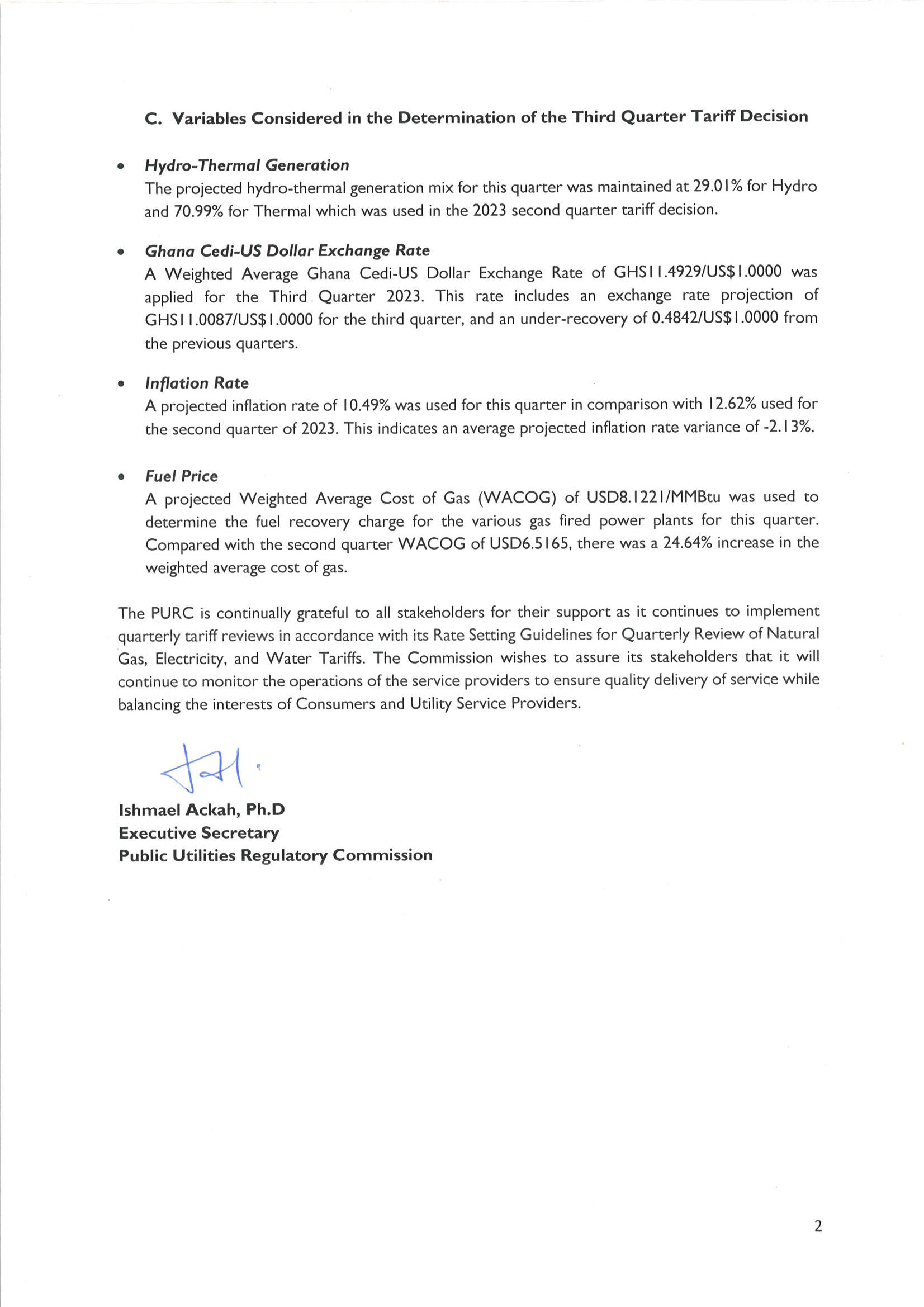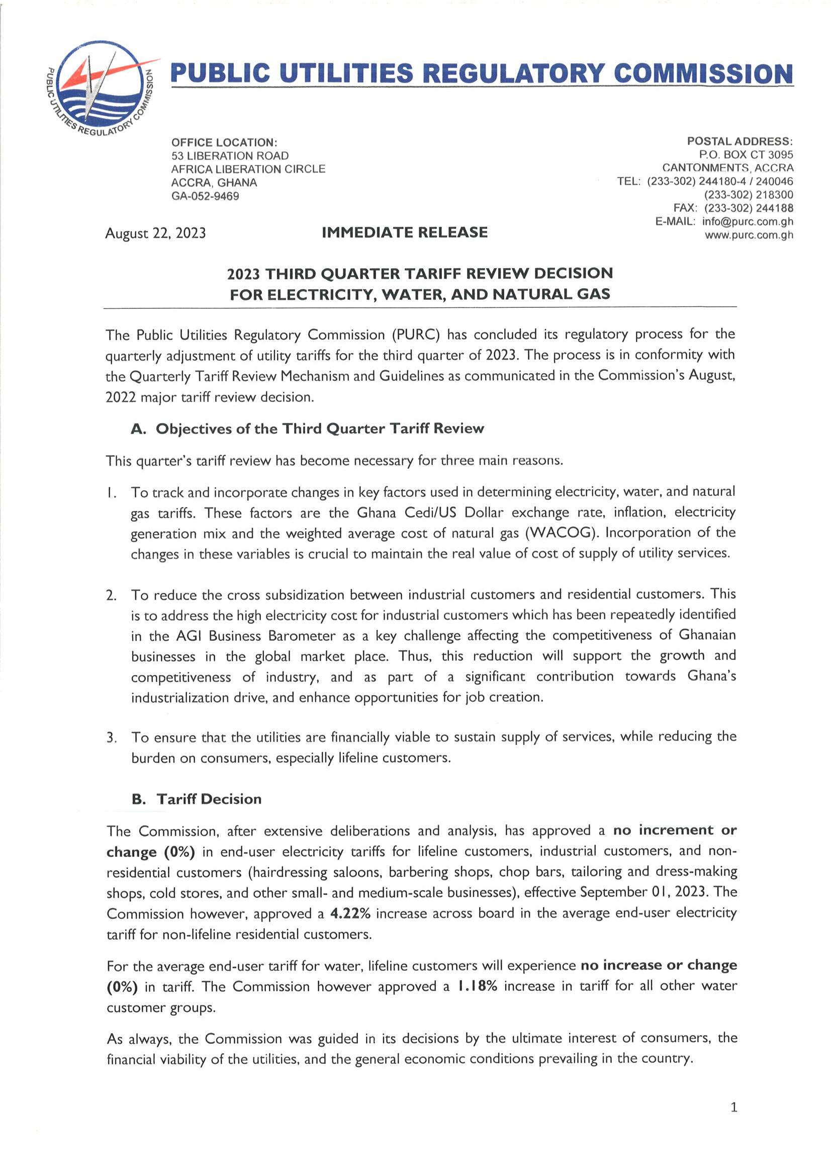 In a statement released on Tuesday August 22, 2023, the PURC said the primary objective behind the tariff adjustment is to ensure that the real value of the cost of providing utility services is upheld.