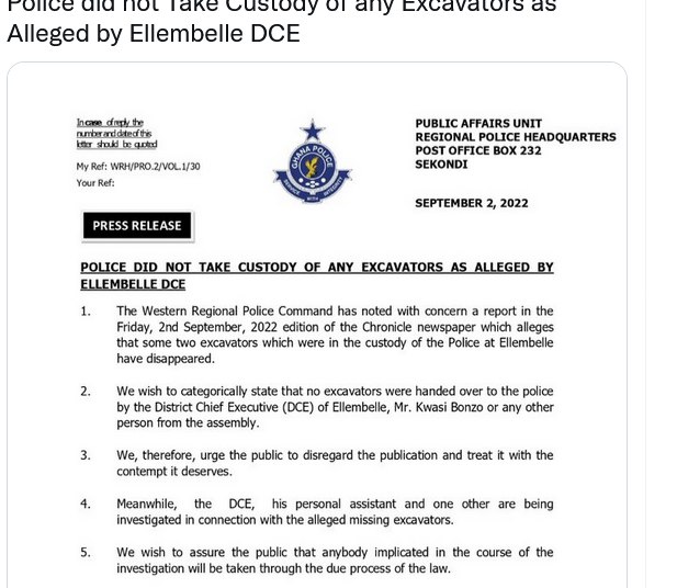 A statement issued by the Police said “While the team of police officers were escorting the excavator to Takoradi, at the Axim Junction, the DCE of Ellembelle, Mr Kwasi Bonzo organized and led some thugs to attack the police and obstruct the operation.
