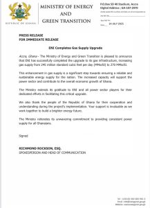 The Ministry of Energy and Green Transition has confirmed the successful completion of a critical infrastructure upgrade by ENI Ghana, aimed at enhancing the country’s gas supply capacity.
