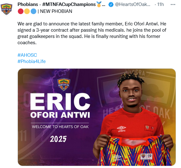 He signed a 3-year contract after passing his medicals. He joins the pool of great goalkeepers in the squad,” Hearts of Oak announced.