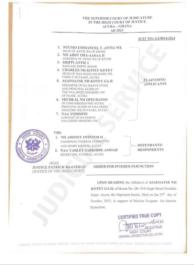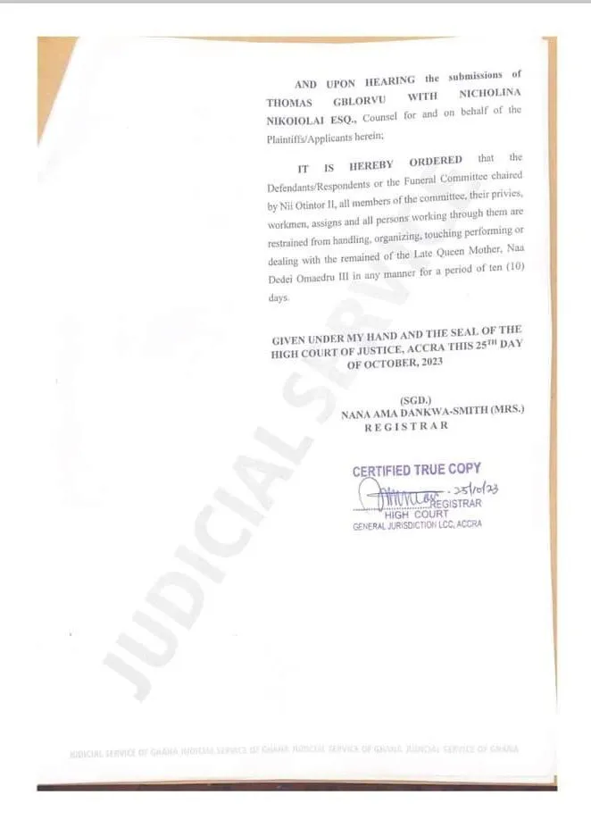 According to the court order, “the Funeral Committee chaired by Nii Otintor II, all members of the committee, their privies, workmen, assigns, and all persons working through them are restrained from handling, organising, touching, performing, or dealing with the remains of the Late Queen Mother, Naa Dedei Omaedru III, in any manner for a period of ten (10) days”.