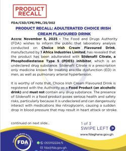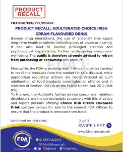 The Food and Drugs Authority (FDA) has issued an immediate recall of Choice Irish Cream Flavoured Drink after laboratory tests confirmed that the product had been adulterated with Sildenafil Citrate, a prescription-only medicine used to treat erectile dysfunction and pulmonary arterial hypertension.