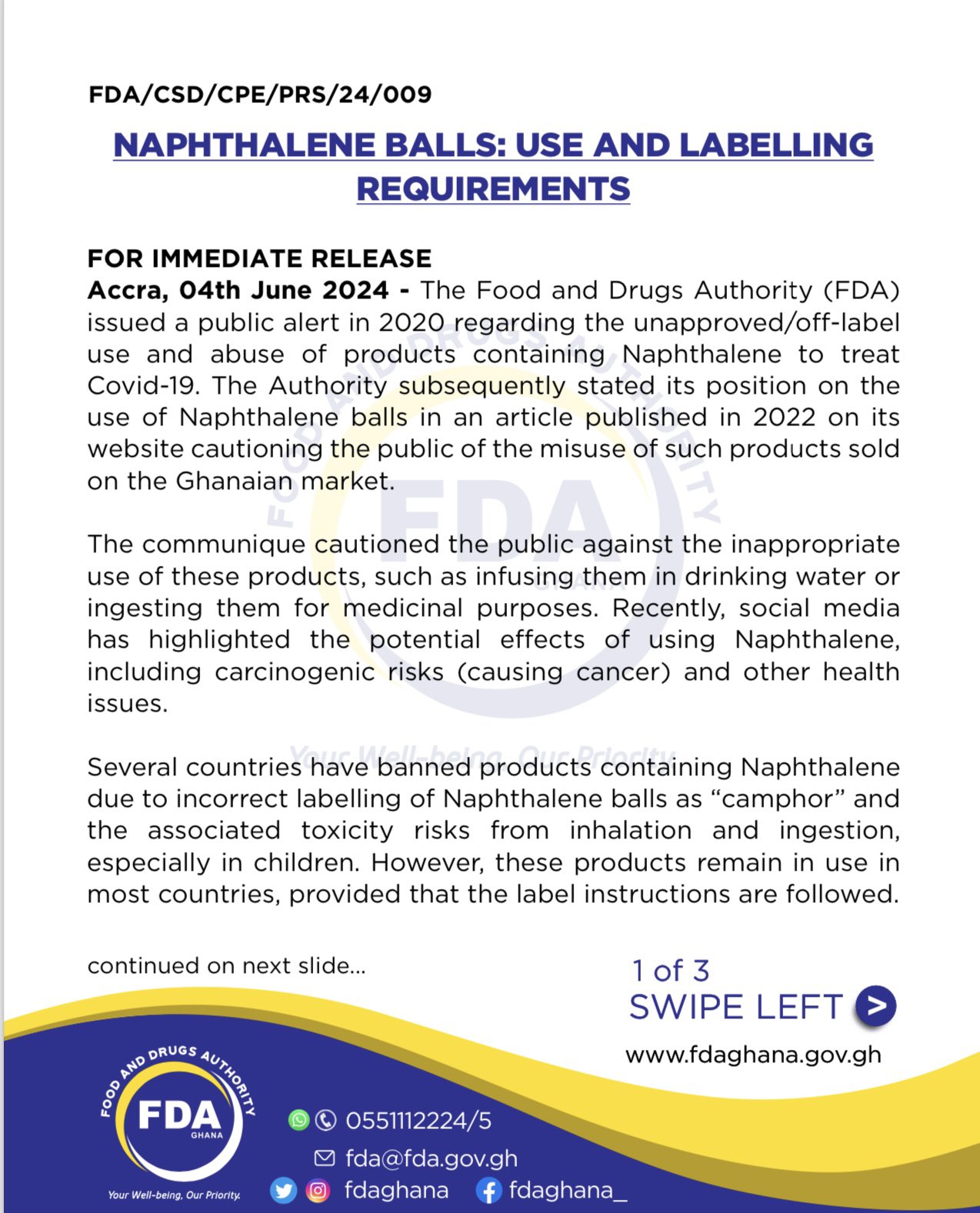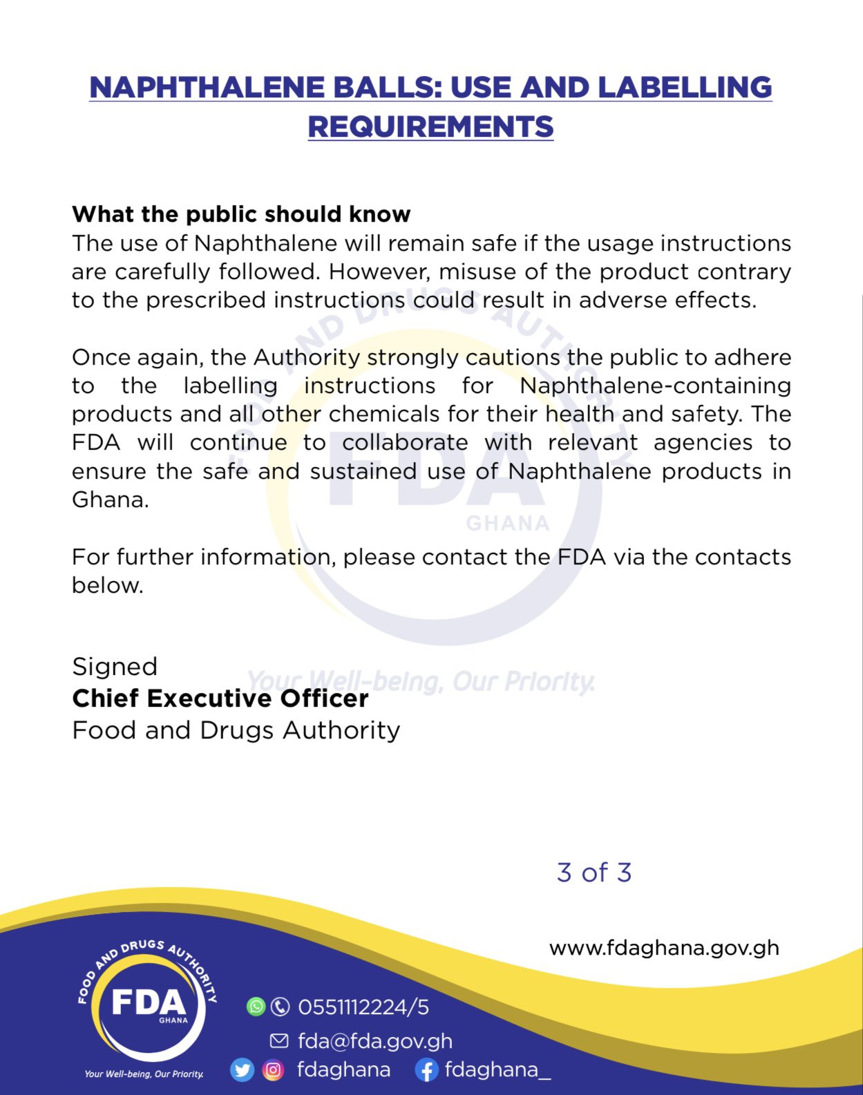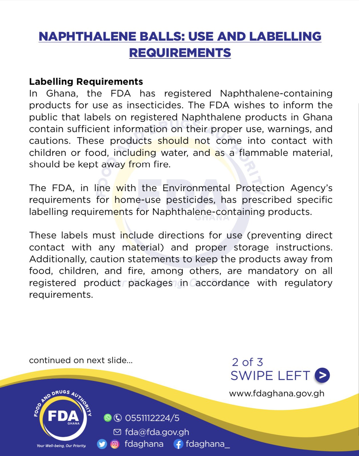 “In Ghana, the FDA has registered Naphthalene-containing products for use as insecticides. The FDA wishes to inform the public that labels on registered Naphthalene products in Ghana contain sufficient information on their proper use, warnings, and cautions.