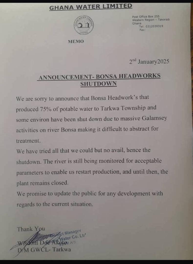 The Ghana Water Company Limited (GWCL) has announced the closure of the Bonsa Headworks, which supplies 75% of the potable water to Tarkwa Township and its environs.