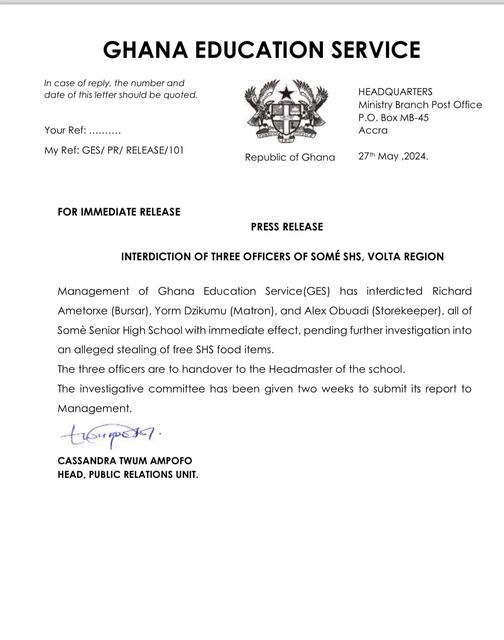 Meanwhile in a statement released by GES on Monday May 27, 2024, Richard Ametorxe, a Bursar, Yorm Dzikunu, a Matron and Alex Obuadi, a storekeeper have all been interdicted with immediate effect pending investigations.