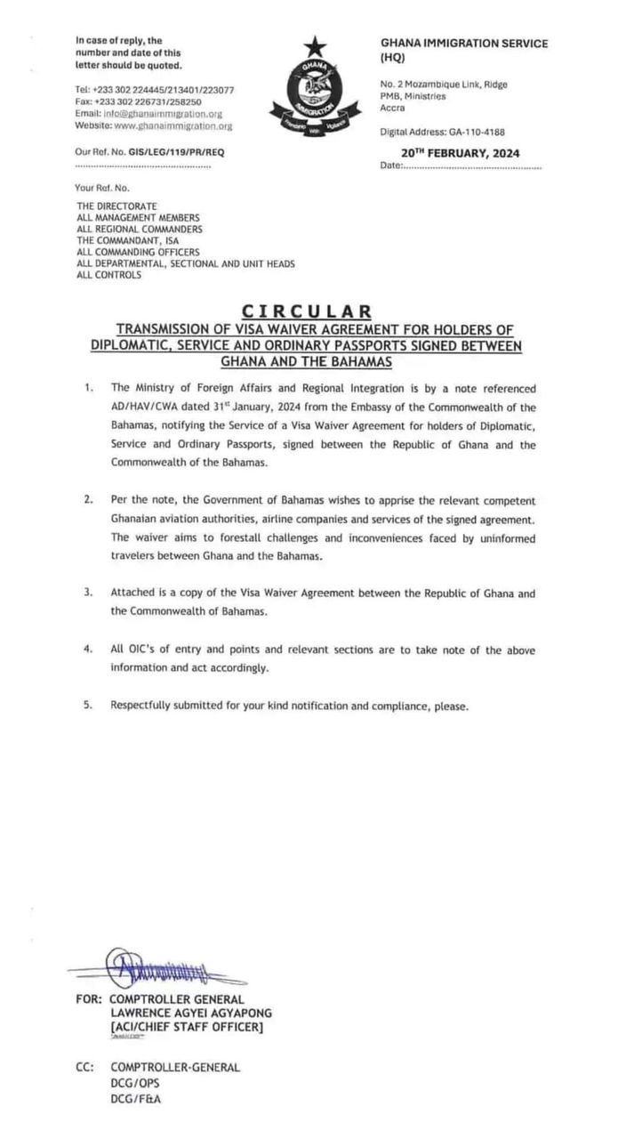 The agreement seeks to forestall challenges and inconveniences faced by uninformed travelers between Ghana and the Bahamas.