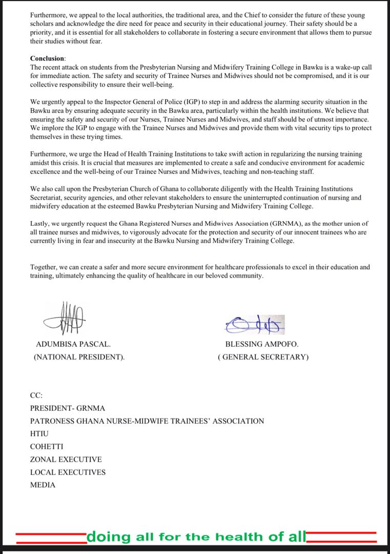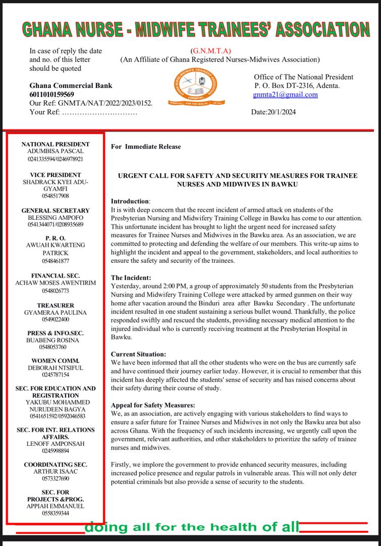The Ghana Nurse-Midwife Trainees’ Association has appealed to government and other stakeholders to enhance security measures at the Bawku Presbyterian Nursing and Midwifery Training College in response to an armed attack on approximately 50 students on January 19, 2024.