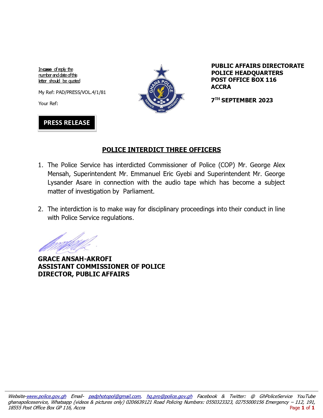 The Police Service has interdicted Commissioner of Police COP Mr. George Alex Mensah, Superintendent Mr. Emmanuel Eric Gyebi and Superintendent Mr. George Lysander Asare in connection with the audio tape which has become a subject matter of investigation by parliament.