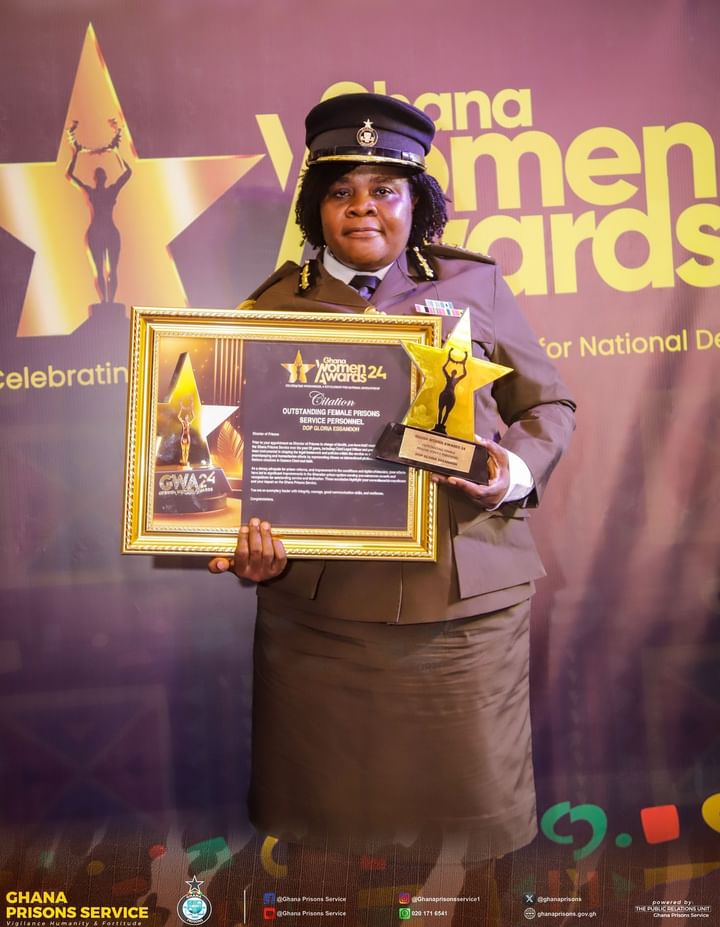 Madam Gloria Essandoh (Esq.), the Director of Prisons in charge of Health, has been honored as the Outstanding Prisons Service Female Personality in the Security Services category at the prestigious Ghana Women Awards 2024.