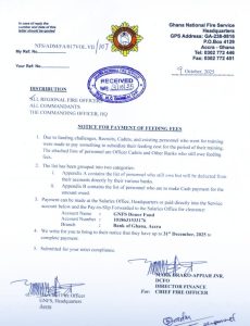 The Ghana National Fire Service (GNFS) has instructed its recruits, cadets, and some serving officers to settle outstanding feeding fees accumulated during their training.