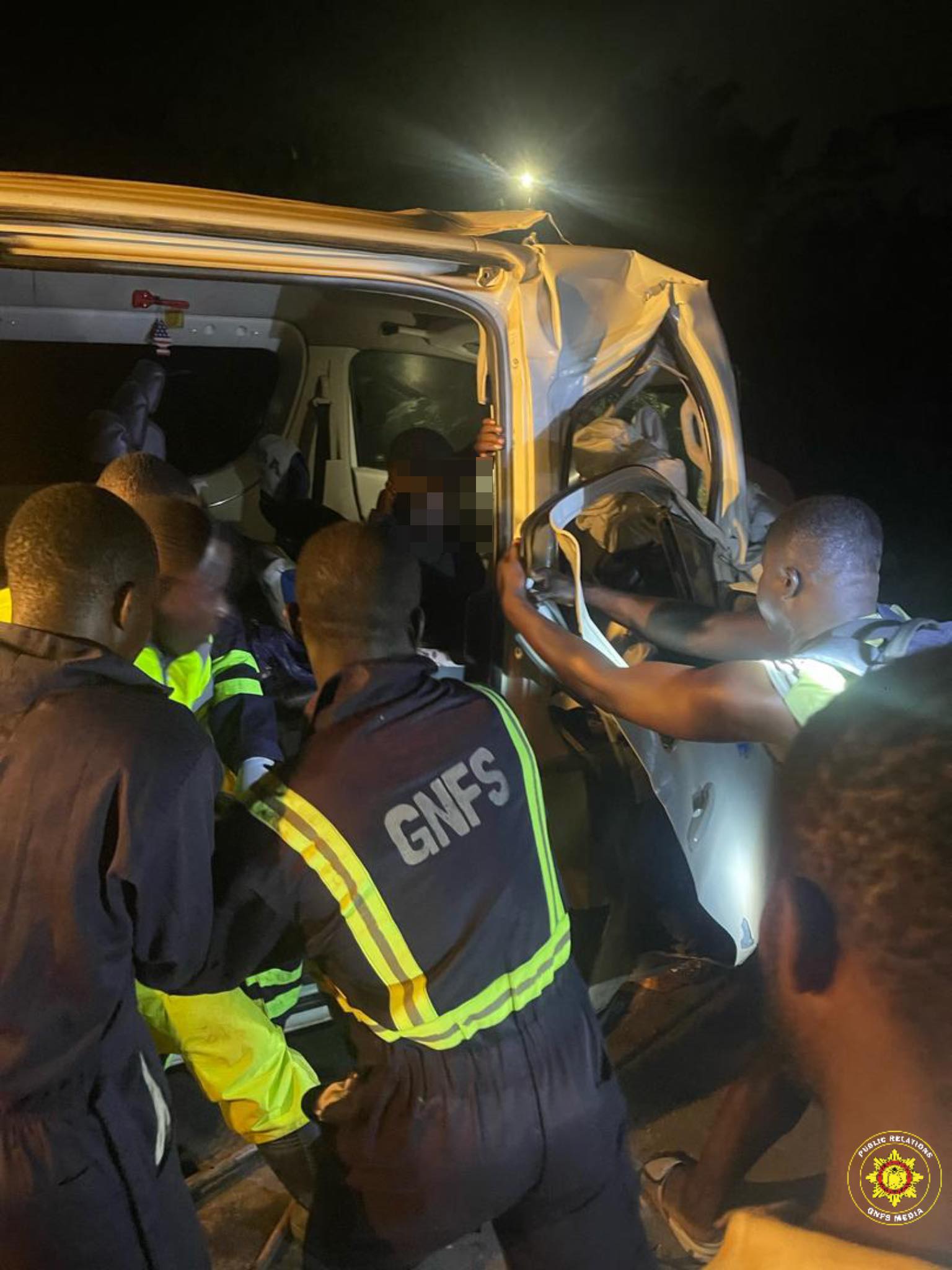 Later that night at 10:16 p.m., a Toyota Hiace minibus (GX 6776-21) collided with a stationary trailer (GT 2608-17) at Hweremoase. The Fomena Fire Station team responded promptly at 10:28 p.m., working to free a passenger trapped in the front seat and ensuring all 13 passengers received emergency care. They were also sent to the Fomena Government Hospital.