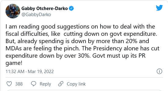 Reacting to these suggestions, Gabby said in a tweet that “I am reading good suggestions on how to deal with the fiscal difficulties, like cutting down on govt expenditure. However, already spending is down by more than 20% and MDAs are feeling the pinch. The Presidency alone has cut expenditure down by over 30%.