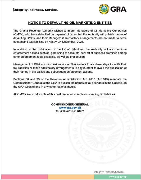 The Ghana Revenue Authority wishes to inform managers of Oil Marketing Companies [OMCs], who have defaulted on payment of taxes that the Authority will publish names of defaulting OMCs, and their Managers if satisfactory arrangements are not made to settle outstanding tax liabilities by Friday, December 3, 2021.