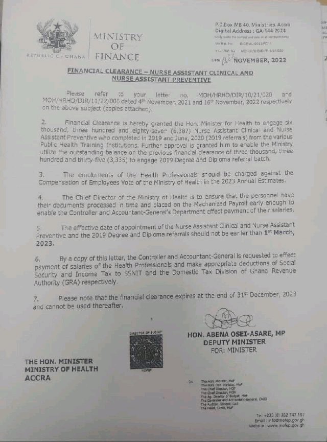 The Ministry of Finance made this announcement in a statement signed by the Deputy Minister for Finance, Abena Osei-Asare, dated November 16, 2022, and copied to the Minister of Health, Kwaku Agyeman-Manu.