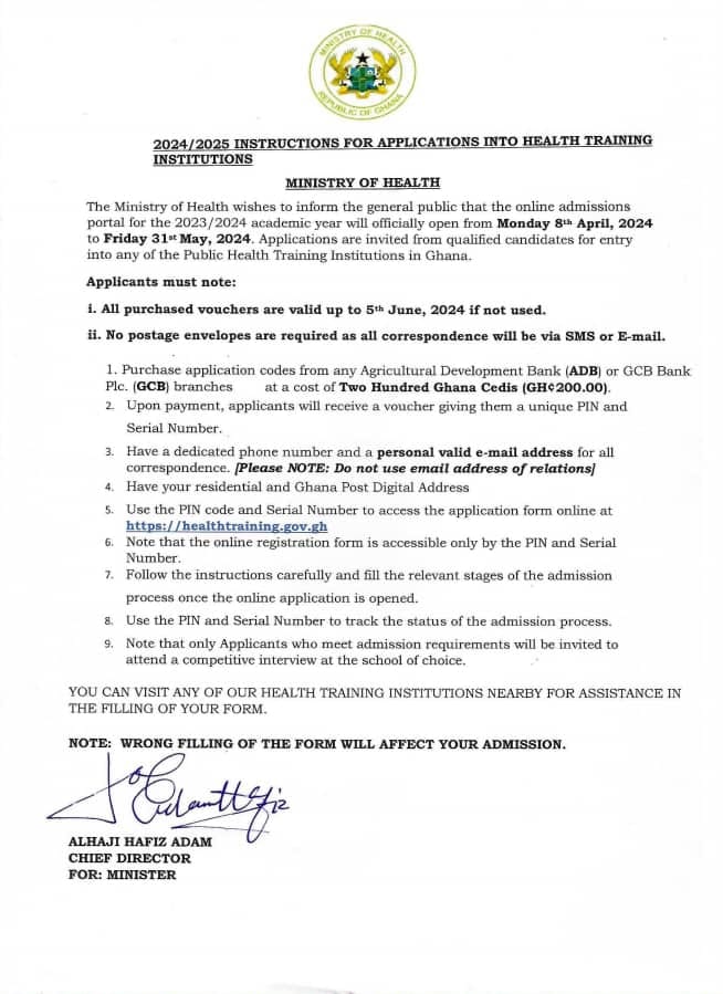 The ministry added that, upon payment, applicants will receive a voucher giving them a unique PIN and serial number to access the application form online at https: //healthtraining.gov.gh