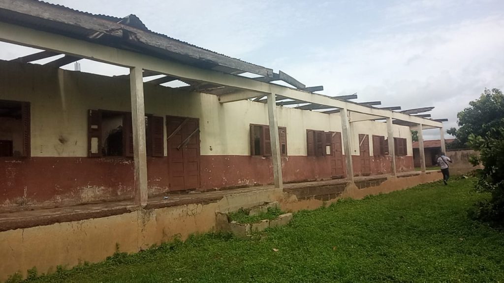 A torrential downpour, accompanied by fierce storm, have ripped off the roof of the Dormaa Ahenkro Presbyterian Junior High School’s venerable block. This block once housed three distinct classes—Form 1 ‘A’, Form 1 ‘B’, and Form 2 ‘A’—along with the assistant headmaster’s office.