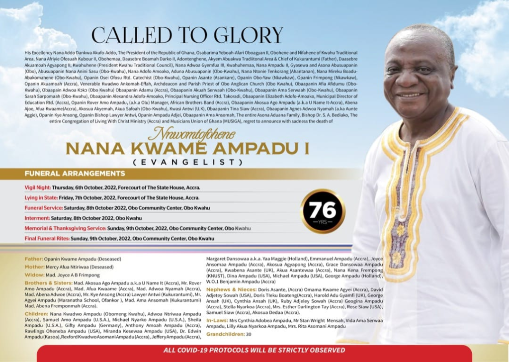 The burial rites of veteran highlife legend, Nana Ampadu is set to come off on Saturday, October 8, 2022.