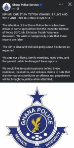 The Ghana Police Service has dismissed widespread rumours suggesting that the Inspector-General of Police (IGP), Christian Tetteh Yohuno, has passed away.
