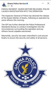 The Inspector-General of Police (IGP), Christian Tetteh Yohuno, has directed the immediate release of Nana Adwoa Gyemfua, the Queenmother of Kwahu, following a controversial police operation at the Abene Palace early Monday morning, November 17.