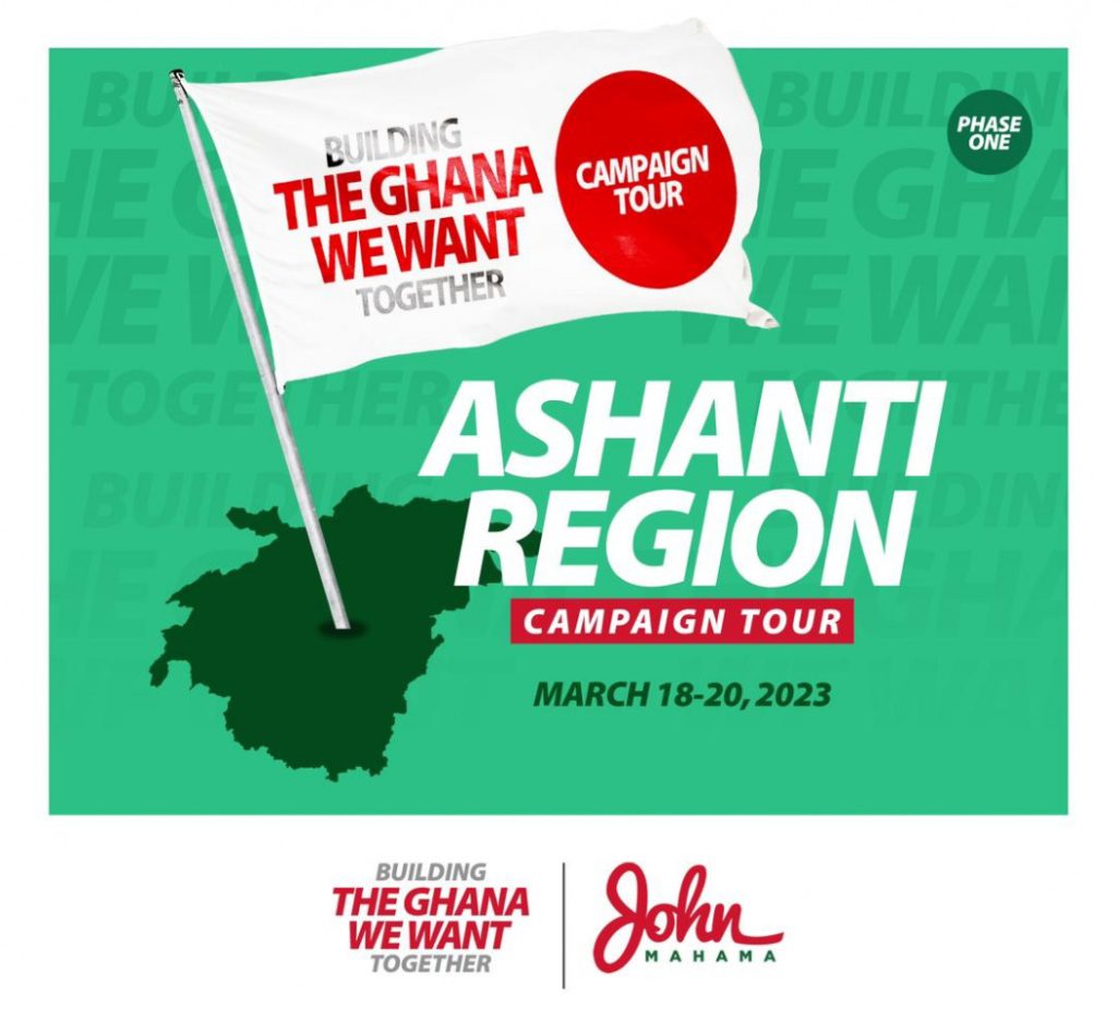 Former President John Dramani Mahama will begin a three-day campaign tour of the Ashanti Region on Sunday, March 18, 2023.