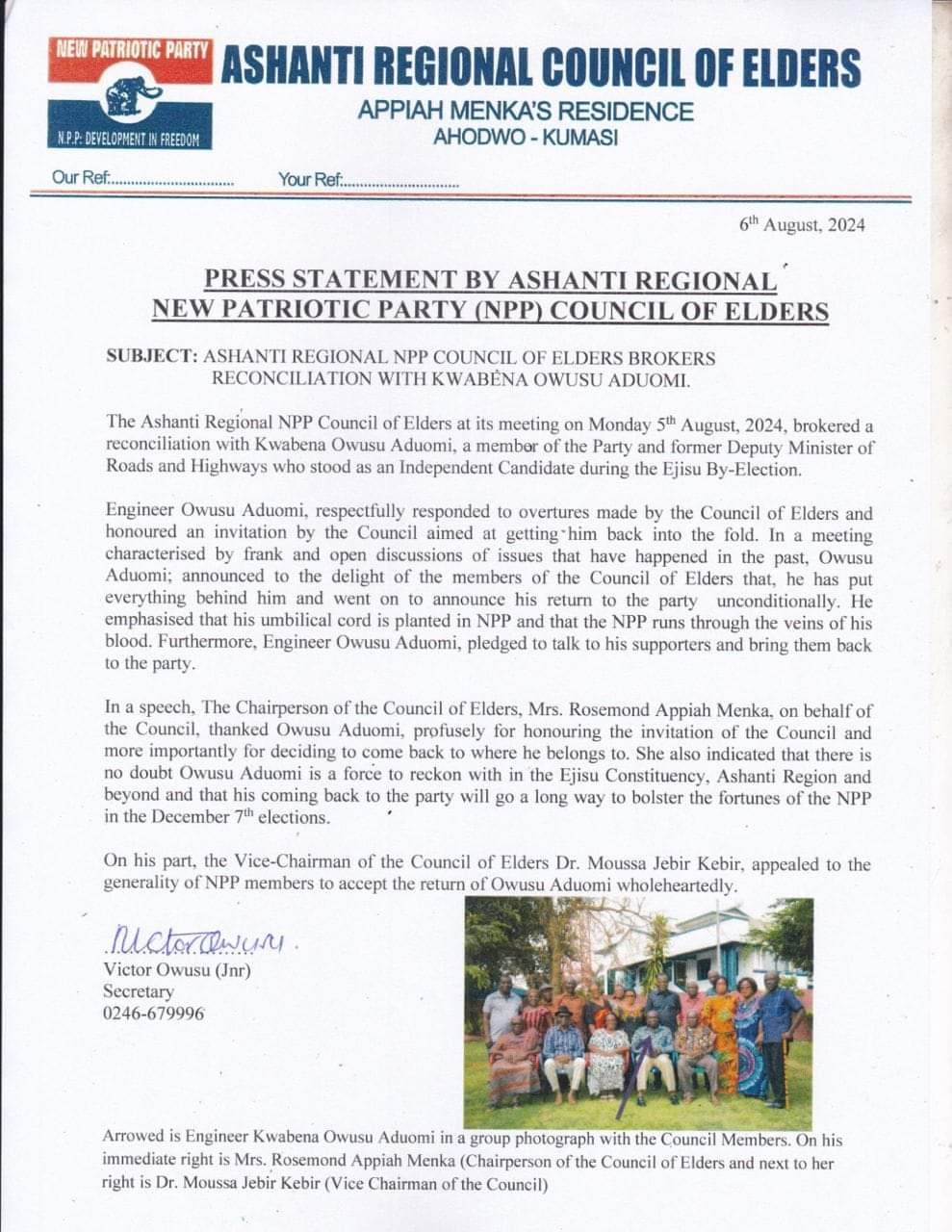 “Owusu Aduomi announced to the delight of the members of the Council of Elders that, he had put everything behind him and went on to announce his return to the party unconditionally. He emphasised that his umbilical cord is planted in NPP and that the NPP runs through the veins of his blood. Furthermore. Engineer Owusu Aduomi pledged to talk to his supporters and bring them back to the party,” portion of the statement read.