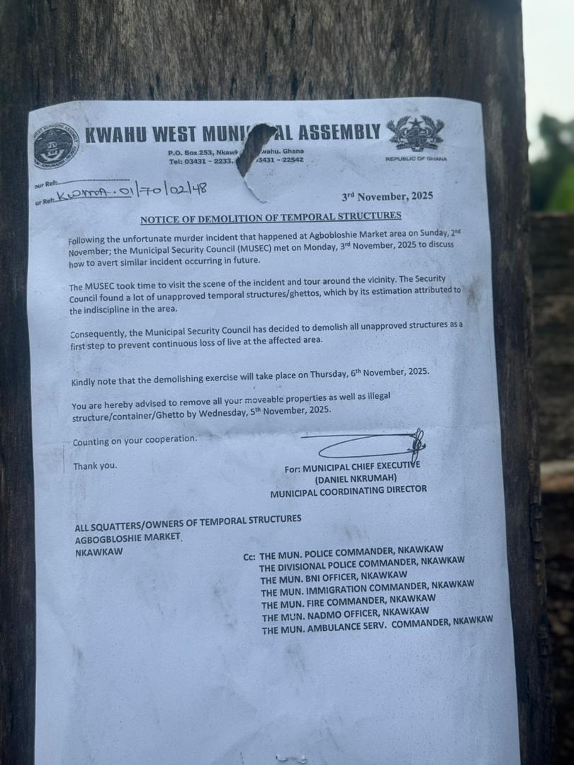 A statement signed by the Municipal coordinating director, Mr. Daniel Nkrumah on behalf of the MCE and released on Tuesday, November 4, acknowledged that the demolition exercise will take place on Thursday, November 6.