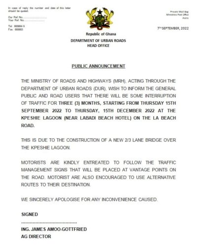 The Ministry of Roads and Highways has communicated to the General public there will be an interruption in the free flow of vehicular traffic on the Kpeshie lagoon stretch of the La Beach Road for three months effective Thursday, September 15 to Thursday, December 15, 2022.