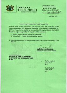 The nominations were announced in a statement released by the Ministry of Local Government, Chieftaincy and Religious Affairs on Thursday, July 17, 2025. The appointments are in line with Article 243(1) of the 1992 Constitution and Section 20(1) of the Local Governance Act, 2016 (Act 936).