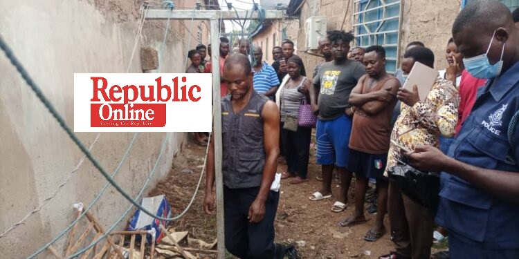 The deceased, identified as Worlanyo Kumah who works at the Universal Merchant Bank [UMB], Agbogbloshie branch as a security officer was found early hours of Monday, July 19, hanged on a metal of a drying line.