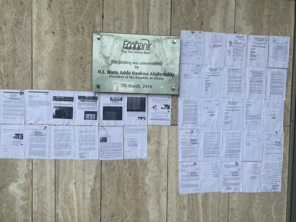 At the premises of the Head Office of Ecobank Ghana Limited on Thursday, December 23, 2021, a court bailiff was seen executing the task of serving the three persons as well as pasting the court processes on the Head Office building.