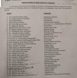 Other names included in the list were former Minister of Local Government and Rural Development Hajia Alima Mahama, who is heading to Washington DC, United States of America as Ghana’s mission, Papa Owusu-Ankomah will still be in London, UK if sworn in while Alhaji Rashid Bawa will also continue to be in Abuja, Nigeria.