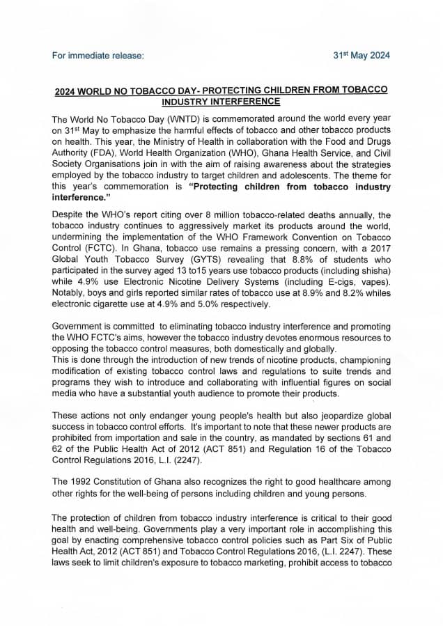 The Ministry of Health in collaboration with the Food and Drugs Authority (FDA), World Health Organization (WHO), Ghana Health Service, and Civil Society Organizations have intensified campaign in raising awareness about the strategies employed by the tobacco industry to target children and adolescents.