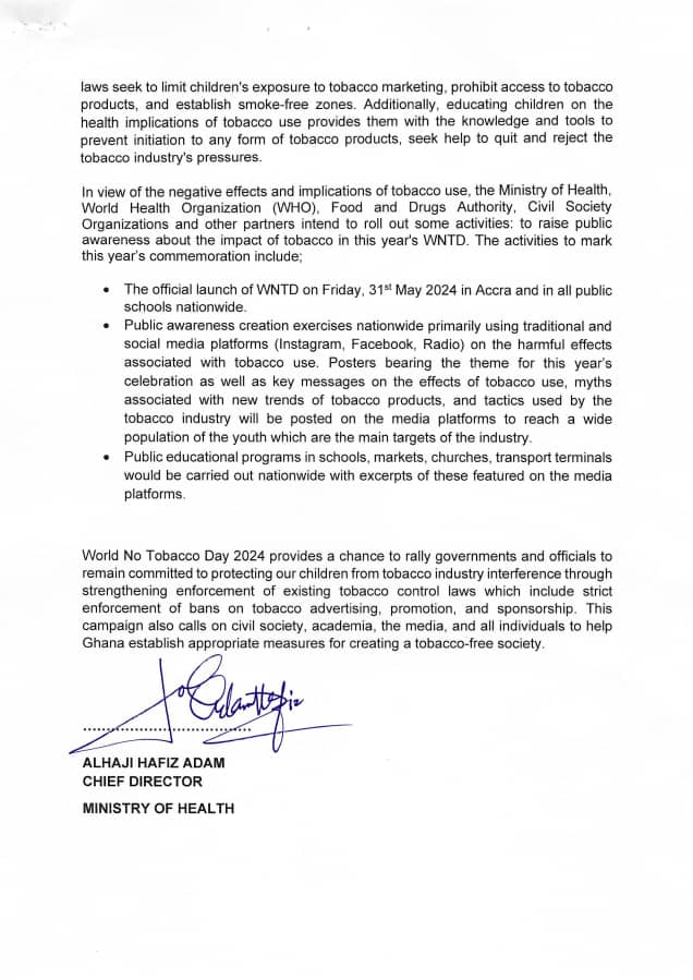 Reiterating government’s commitment in eliminating tobacco industry interference and promoting the WHO FCTC’s aims, the ministry noted that it will commence a public awareness creation exercise nationwide primarily using traditional and social media platforms and organizing public educational programs in schools, market centers, churches and transport terminals.