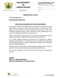The Ministry of Roads and Highways, acting through the Department of Urban Roads, has announced a traffic diversion on the Tema Motorway as a result of ongoing construction work on the Flowerpot Interchange project.