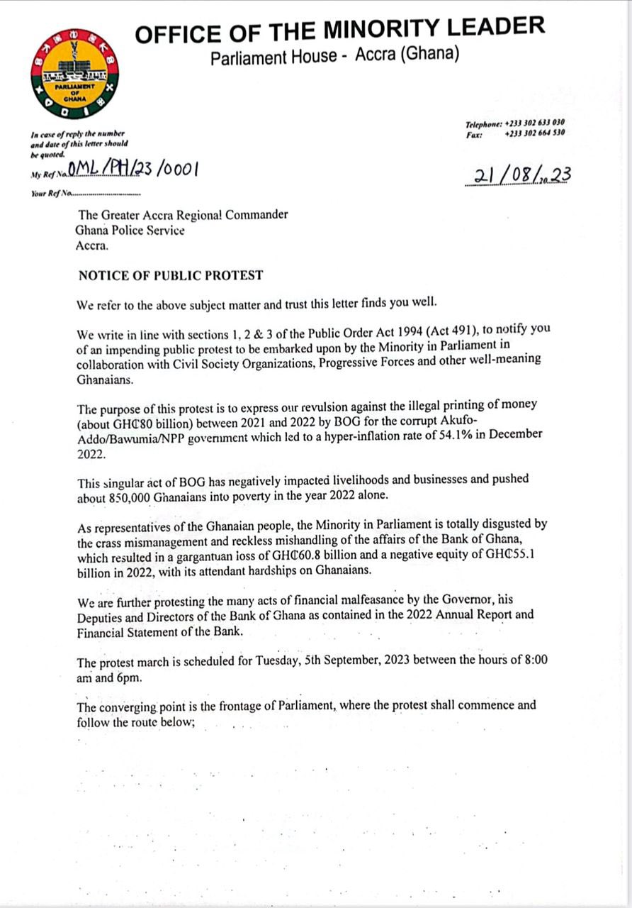 “We write in line with sections ,1 2&3 of the Public Order Act 1994 (Act 491), to notify you of an impending public protest to be embarked upon by the Minority in Parliament in collaboration with Civil Society Organizations, Progressive Forces and other well-meaning Ghanaians.”