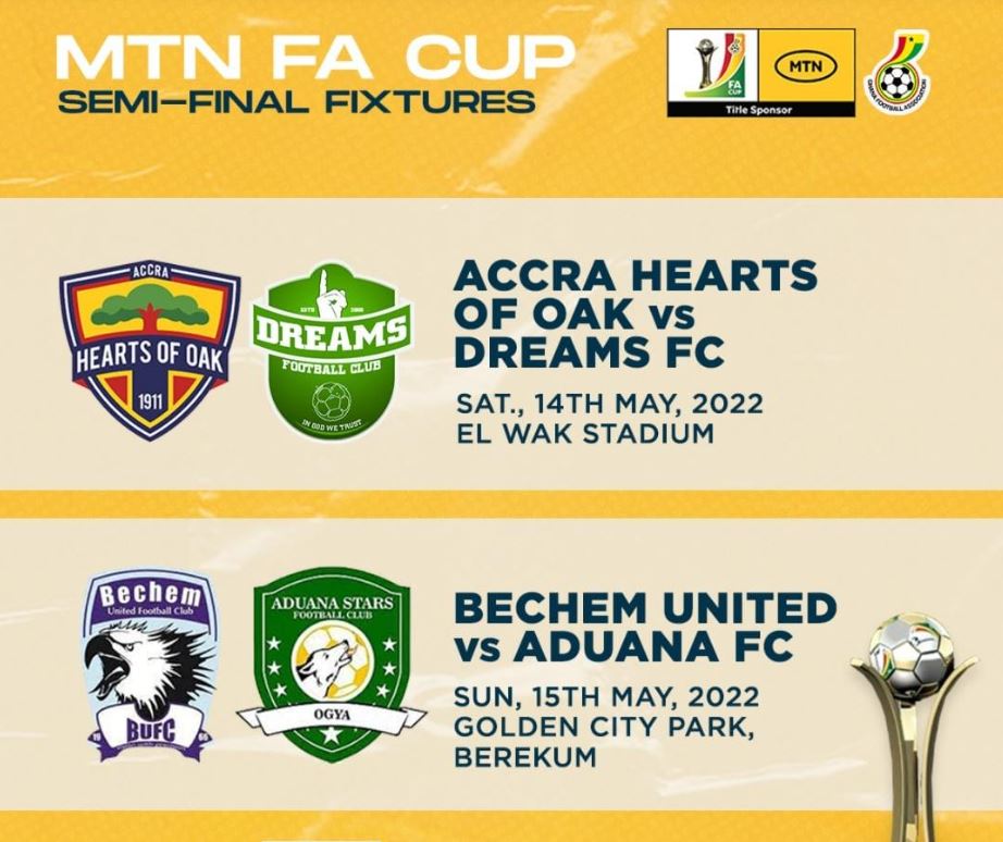 The MTN FA Cup semi-final fixtures have been scheduled for Saturday May 14 and Sunday May 15 at the El Wak Stadium and Golden City Park in Berekum respectively.